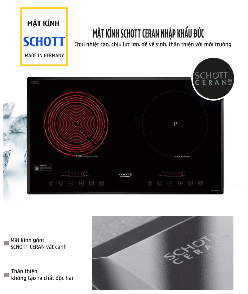 Bếp điện từ Chefs EH MIX321 là mẫu bếp bình dân nhưng sở hữu được vẻ bề ngoài đẹp mắt, được trang bị mặt kính Schott Ceran cùng với đó là linh kiện EGO nhập khẩu Đức.Với những tiêu chí nổi bật trong phân khúc giá rẻ, bếp điện từ Chefs EH MIX321 có xứng đáng để bạn chọn lựa?