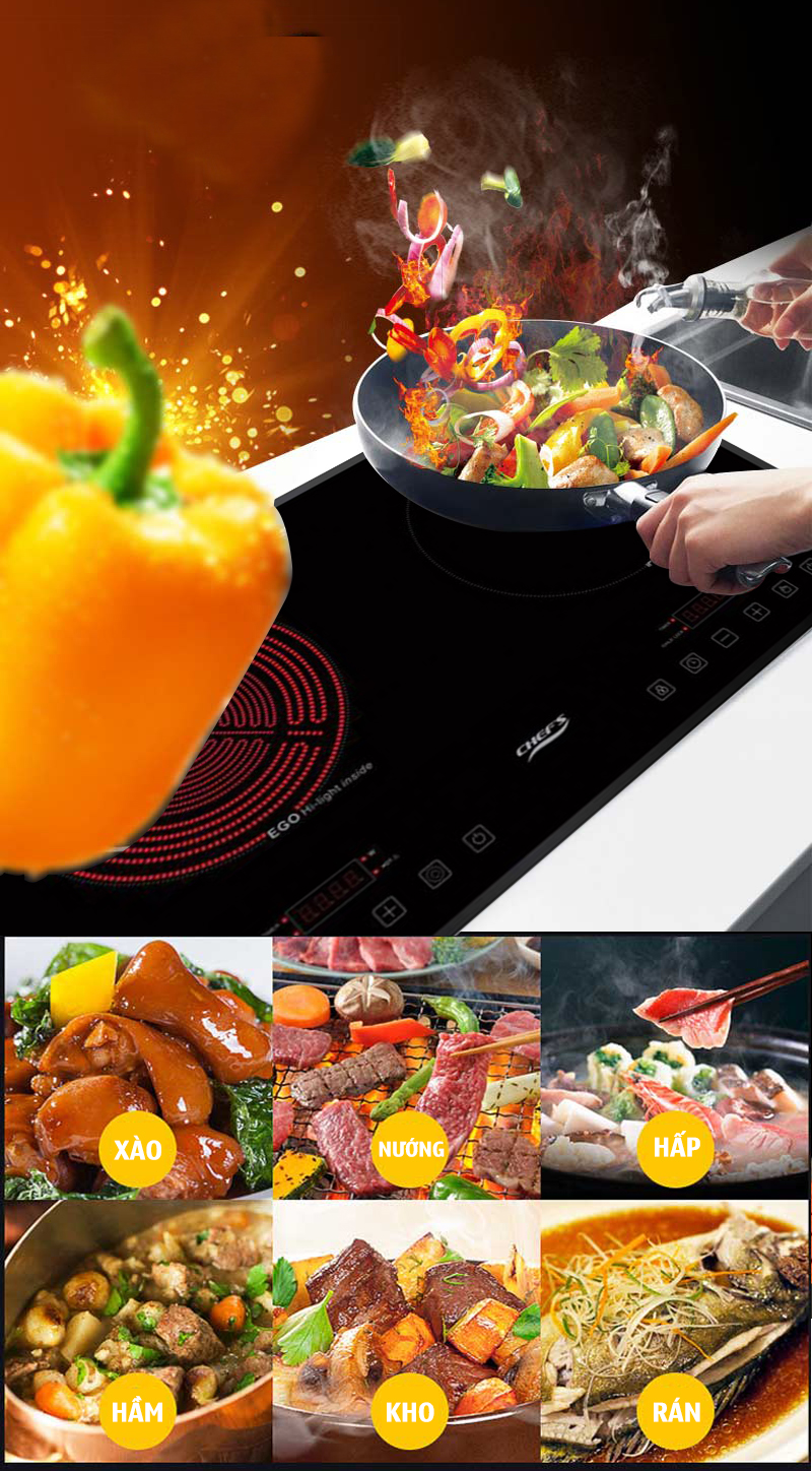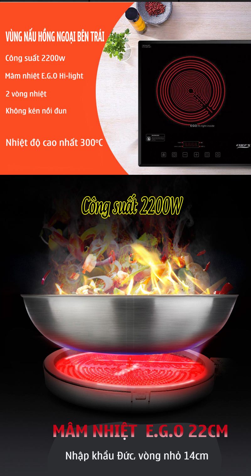 Với công suất 2200w cho vòng lớn (22cm), 1000w cho vòng nhỏ (14cm) đảm bảo cho việc đun nấu tiện dụng hơn với các kích cỡ nồi chảo từ nhỏ đến lớn. Đặc biệt với vùng nấu này có thể sử dụng được mọi loại nồi chảo từ nồi nhôm, thủy tinh, inox, gang...Hơn nữa mâm nhiệt EGO được làm bằng sợi cacbon nên có hiệu suất phát nhiệt cao hơn và tuổi thọ cũng lớn hơn gấp nhiều lần các loại mâm nhiệt thông thường.