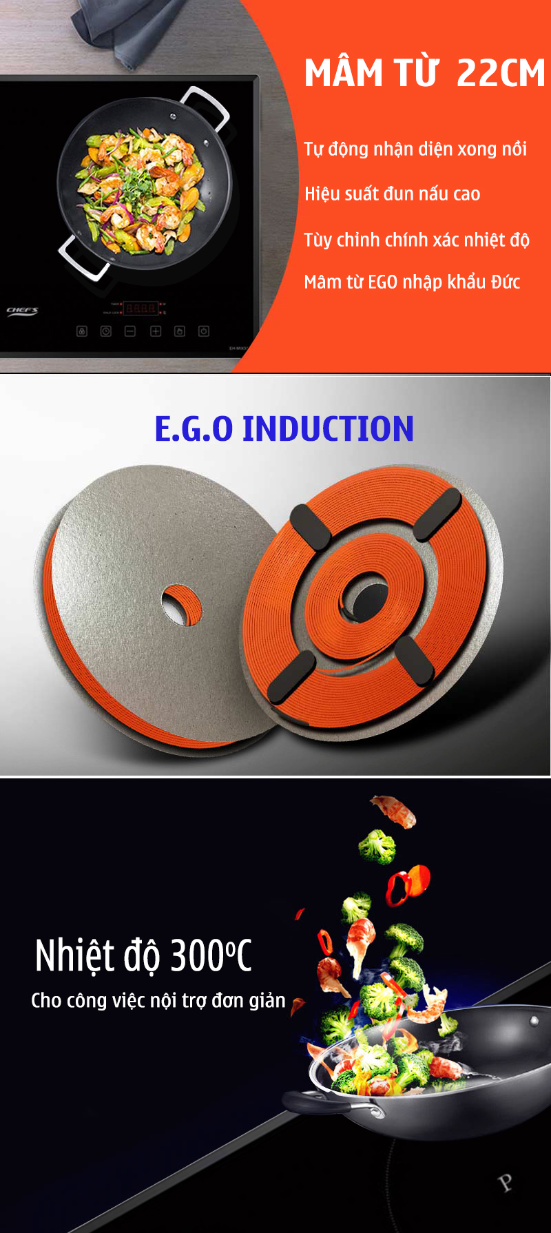 Vùng nấu cảm ứng của bếp điện từ Chefs EH MIX321 có thể tùy một cách chính xác nhiệt độ và công suất giúp công việc nội trợ sẽ đơn giản hơn cho người dùng. Hơn nữa mâm từ EGO của bếp có thể tạo ra mức nhiệt đến 300 độ C đảm bảo chất lượng chế biến các món xào rán cần mức nhiệt cao luôn được đảm bảo.
